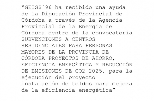 GEISS麓96 ha recibido una ayuda de la Diputaci贸n Provincial de C贸rdoba a trav茅s de la Agencia Provincial de la Energ铆a de C贸rdoba dentro de la convocatoria SUBVENCIONES A CENTROS RESIDENCIALES PARA PERSONAS MAYORES DE LA PROVINCIA DE C脫RDOBA PROYECTOS DE AHORRO, EFICIENCIA ENERG脡TICA Y REDUCCI脫N DE EMISIONES DE CO2. 2025, para la ejecuci贸n del proyecto instalaci贸n de toldos para la mejora energ茅tica.